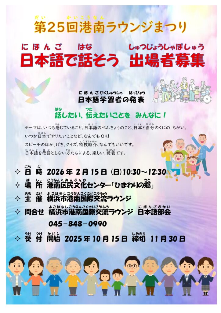 | 申込書をEメール送信 | Eメール送信はこちらから 題名:港南ラウンジ祭り日本語で話そう申込み メッセージ:港南ラウンジ祭り日本語で話そう申込み |