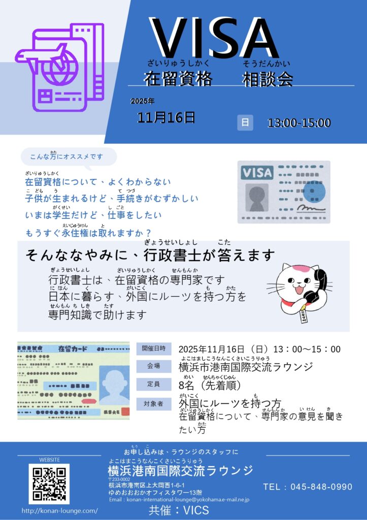 こんな方におすすめです 在留資格について、よくわからない⼦供が⽣まれるけど、⼿続きがむずかしいいまは学⽣だけど、仕事をしたいもうすぐ永住権は取れますか? 在留資格相談会 募集要項 開催日時:2025年11⽉16⽇(⽇)13:00〜15:00会 場:横浜市港南国際交流ラウンジ定 員:8名対象者 :外国にルーツを持つ⽅ 在留資格について専⾨家の意⾒を聞きたい方 チラシ