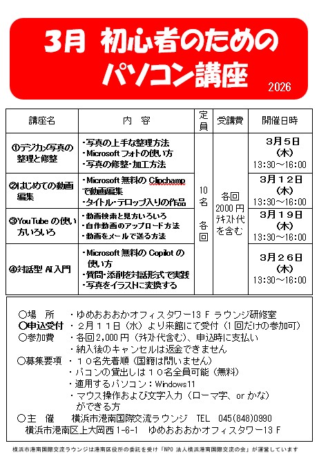 | 募 集 | 10 名(先着順)、パソコンの貸出しは10 名全員可能(無料) |